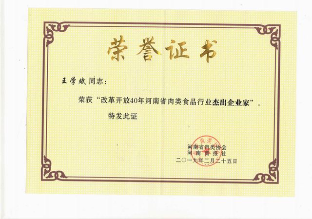 榮譽(yù)‖洛陽正大獲評改革開放40年河南肉類食品行業(yè)強(qiáng)勢企業(yè)、王學(xué)斌***總裁榮獲改革開放40年河南肉類食品行業(yè)杰出企業(yè)家