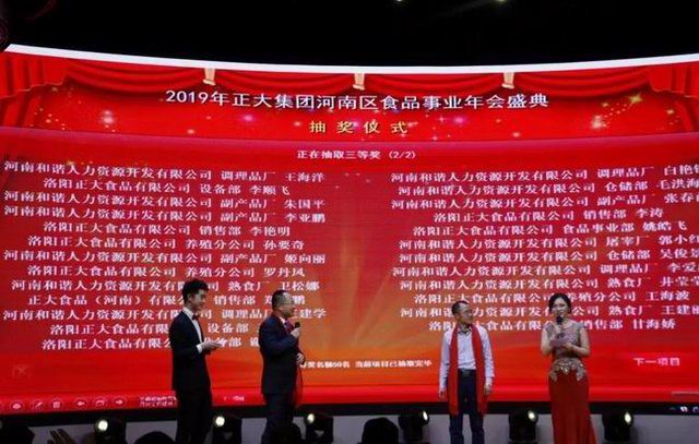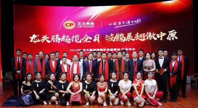 2019年1月21日,“龍頭騰起攬全月,鴻鵠展翅傲中原”——正大集團(tuán)河南區(qū)食品事業(yè)2019新春年會(huì)在洛陽東華大酒樓盛大召開。正大集團(tuán)農(nóng)牧食品企業(yè)(中國)副董事長王鴻章、正大集團(tuán)河南區(qū)食品事業(yè)***總裁王學(xué)斌、正大集團(tuán)河南區(qū)產(chǎn)業(yè)化總裁宋小兵及河南區(qū)食品事業(yè)各公司部門主管、員工代表300余人齊聚一堂,共享盛典。年會(huì)特邀河南東方正大有限公司洛陽飼料廠董事長茹懷智、中方副總經(jīng)理黃天發(fā)及河南和諧人力資源開發(fā)有限公司董事、總經(jīng)理王縣委、副總經(jīng)理張麗云參加。